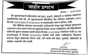 तुळजापूर प्रतिनिधी:- श्रीक्षेत्र तुळजापूर मंदिर प्रशासनाकडून असे कळवण्यात येते की, श्री तुळजाभवानी मातेचा चैत्र पौर्णिमा उत्सव ( 2026 )दिनांक 30/ 03 /2026 ते 03/04/ 2026 या कालावधीत संपन्न होणार आहे. या चैत्री पौर्णिमा महोत्सव कालावधीत शाळांना सुट्ट्या तसेच येणाऱ्या सलग सुट्ट्यांचा विचार करता आणि भाविक भक्तांची गर्दी लक्षात घेता. आई जगदंबेच्या भाविक भक्तांना सुलभदर्शनाचा लाभ घेता यावा म्हणून 31/03/2026 रोजीच्या रात्री 1.00 वाजल्यापासून ते दि.05/04/2026 रात्रीपर्यंत भाविक- भक्तांना बिडकर पायऱ्या येथून सोडण्यात येणार आहे. याची सर्व भाविक- भक्तांनी, पुजारी ,सेवेकरी यांनी नोंद घ्यावी. व मंदिर प्रशासनाला सहकार्य करावे.