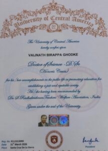 तुळजापूर प्रतिनिधी : आपल्या शिस्तबद्ध वर्तन व अध्यापनाने आणि प्रशासकीय कौशल्याने शैक्षणिक क्षेत्रात वेगळा ठसा उमटवणारे श्री तुळजाभवानी सैनिकी विद्यालयाचे प्राचार्य श्री. वैजनाथ घोडके यांच्या शिरपेचात मानाचा तुरा रोवला गेला आहे. त्यांच्या प्रदीर्घ आणि उल्लेखनीय शैक्षणिक योगदानाची दखल घेत ‘युनिव्हर्सिटी ऑफ सेंट्रल अमेरिका’ या आंतरराष्ट्रीय विद्यापीठाने त्यांना प्रतिष्ठित ‘डॉक्टरेट ऑफ सायन्स’ (D.Sc.) ही पदवी प्रदान करून सन्मानित केले आहे.