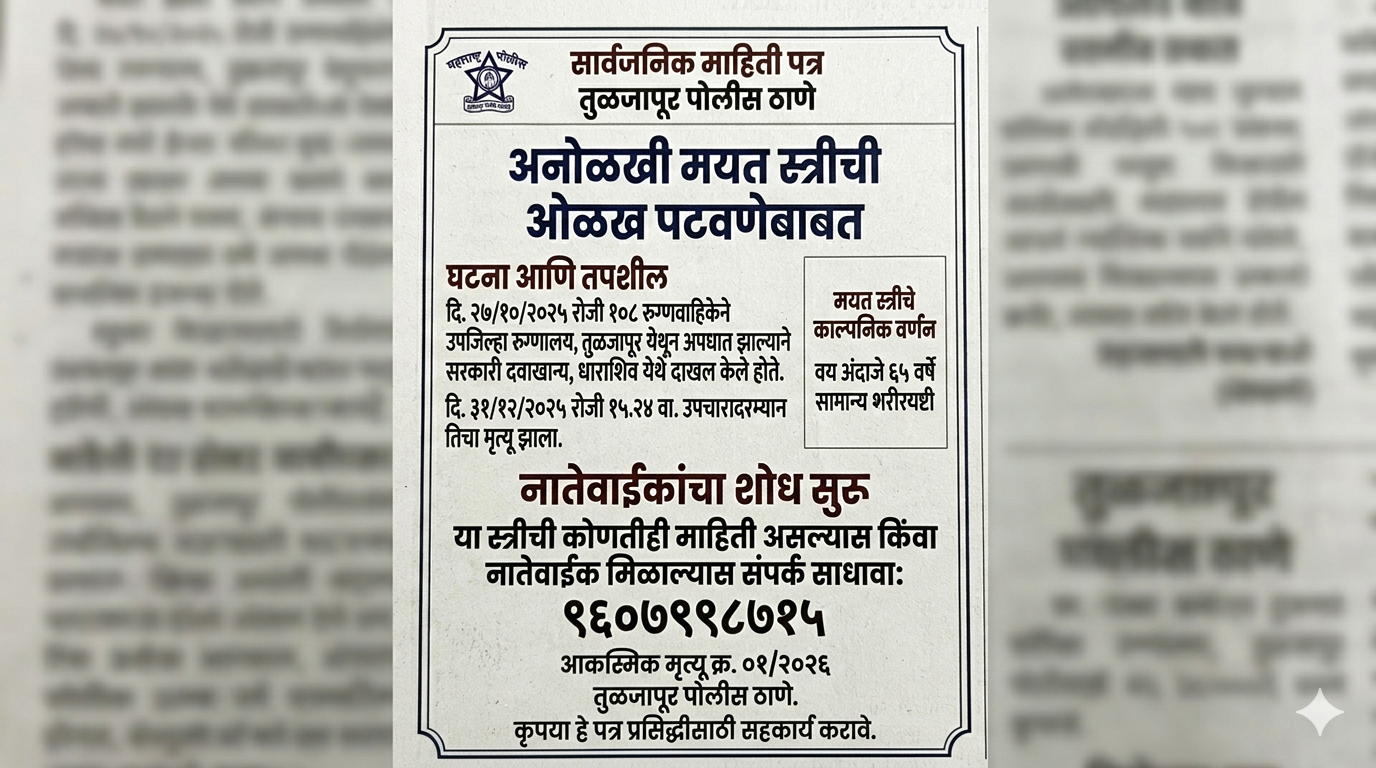 मिळालेल्या माहितीनुसार, आरोपी महिला सुनिता प्रज्योत उंदरे (वय ४०, रा. वाशी, जि. धाराशिव) हिची दि. ९ ऑक्टोबर २०२५ रोजी जिल्हा स्त्री रुग्णालय, धाराशिव येथे प्रसूती झाली होती. यावेळी तिने एका मृत मुलीला जन्म दिला. नियमानुसार, अशा परिस्थितीत मृत अर्भकावर सन्मानपूर्वक अंत्यसंस्कार करणे अपेक्षित होते.